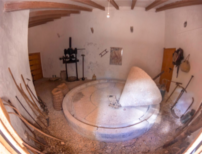 Este molino tradicional funciona por la tracción animal, este va rodando poco a poco y hace girar el eje del molino. Para realizar este trabajo, el animal llevaba enganchado determinadas herramientas como las gafas de palma que le ayudan a no moverse mientras rueda.